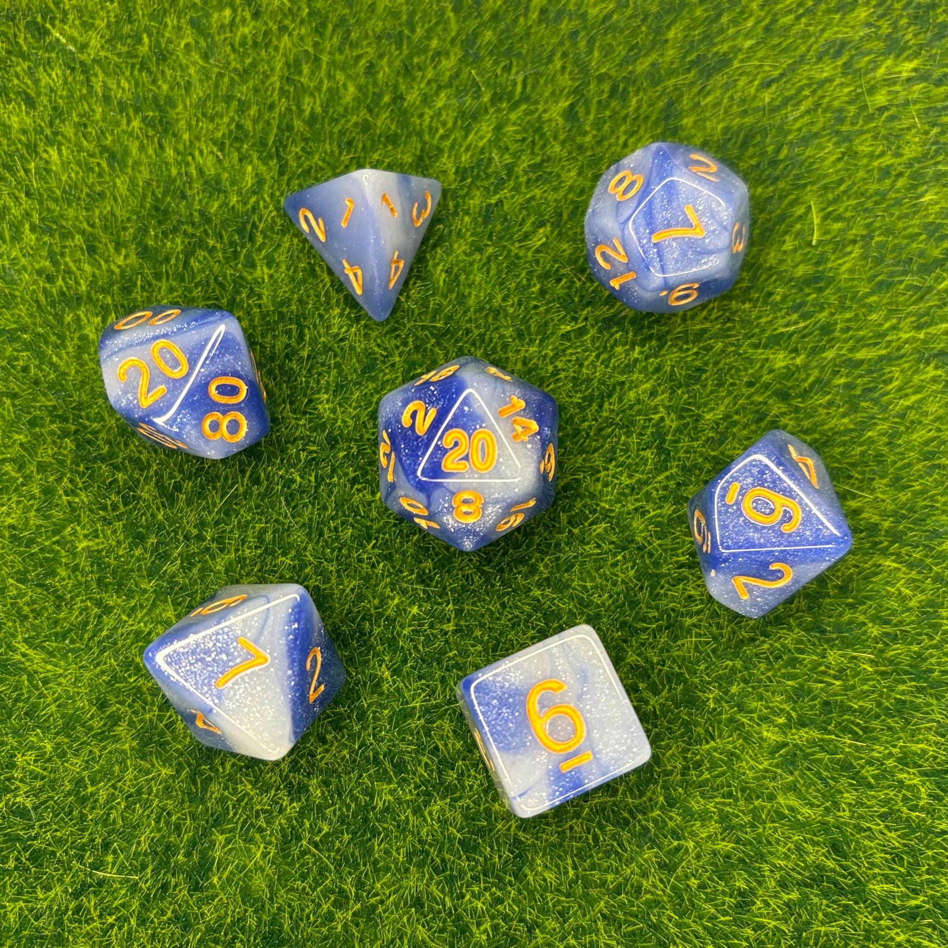 A set of 7 pale blue and white swirled dice with silver micro glitter, numbered in gold.