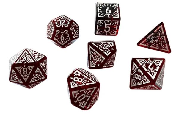 A set of 7 dark red transparent dice with white detailing and numbering.